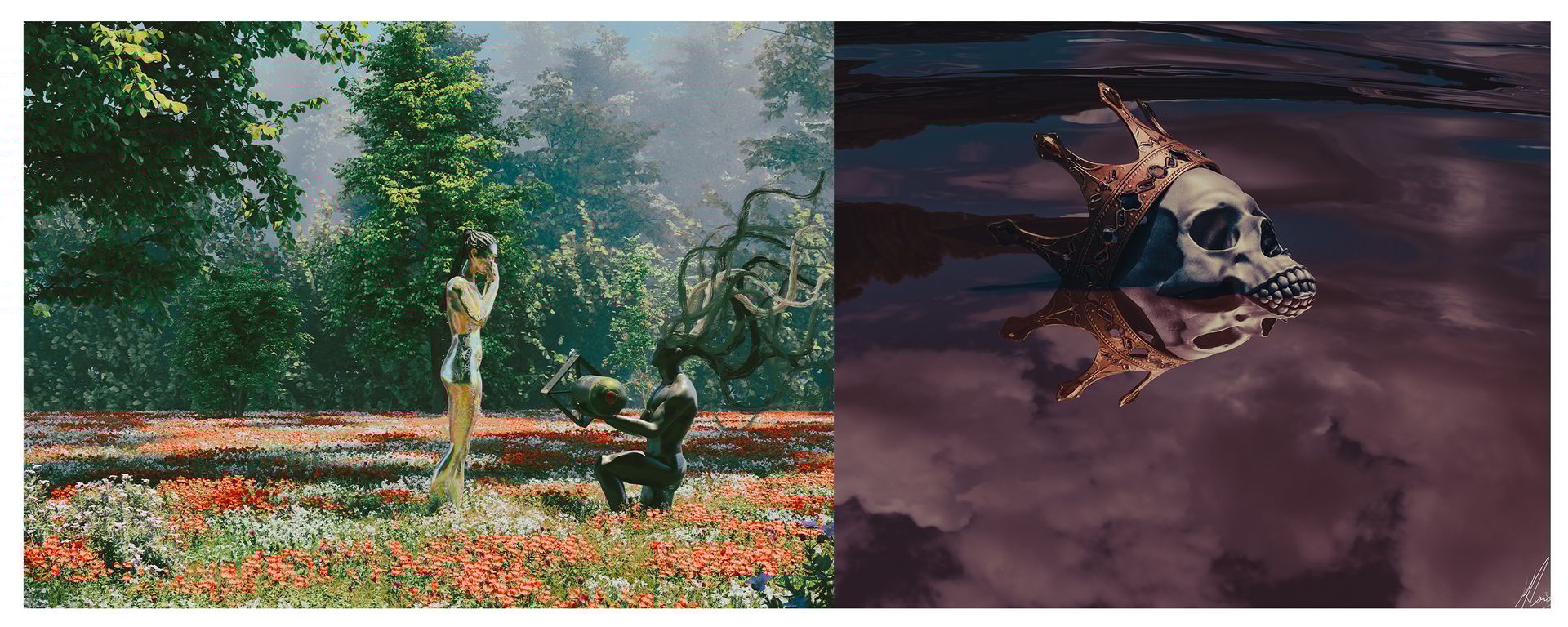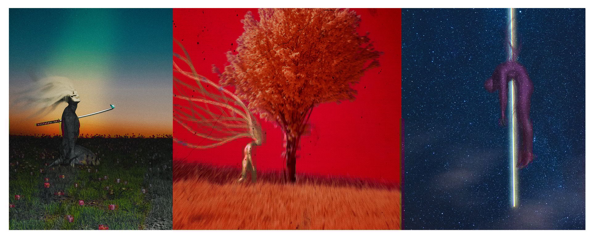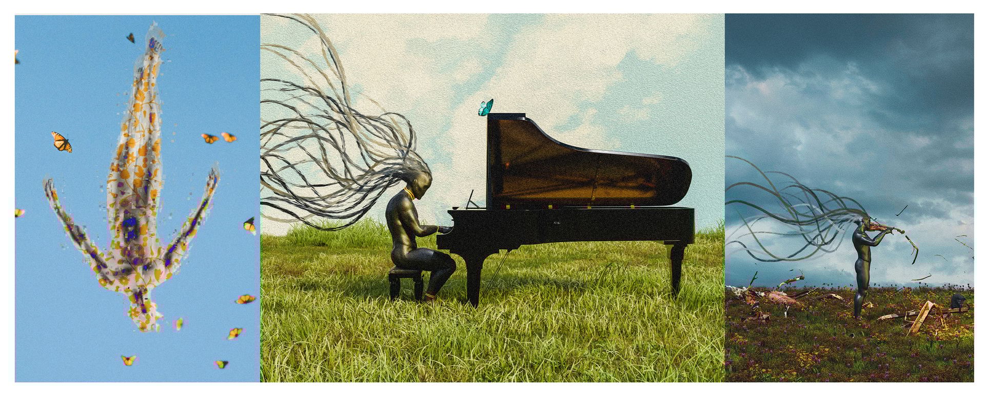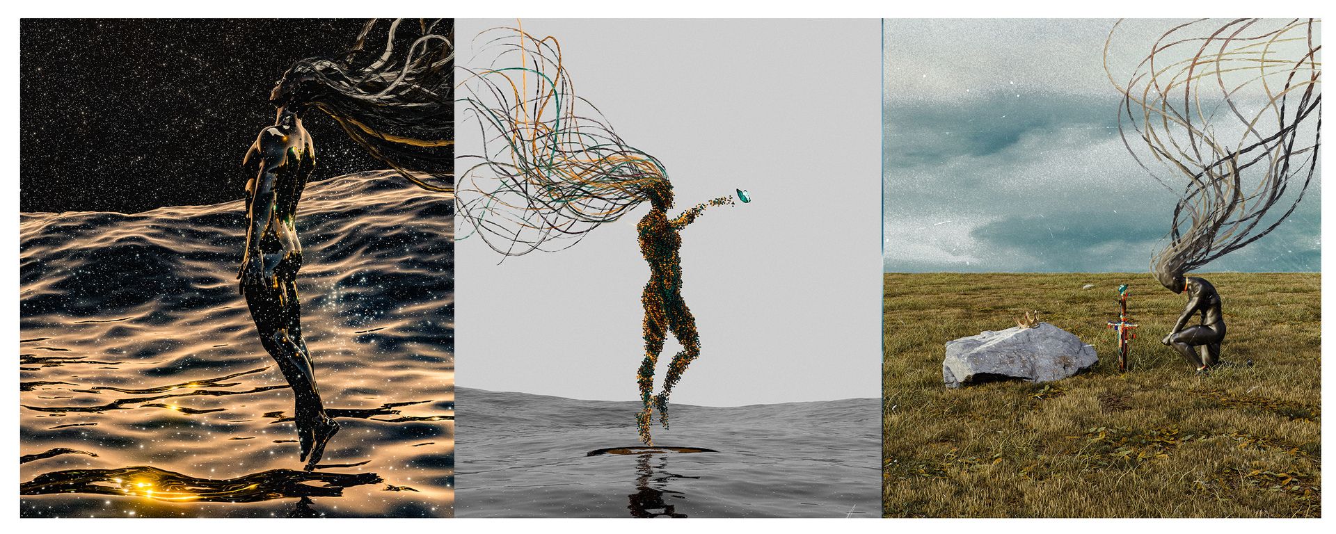 His process: Blender for the base, Procreate to add strands and smudge textures, Photoshop for noise, Lightroom for final lighting. He listens to piano melodies while he works. "I think I'm mostly sad," he says matter-of-factly. "That's the truth of it."