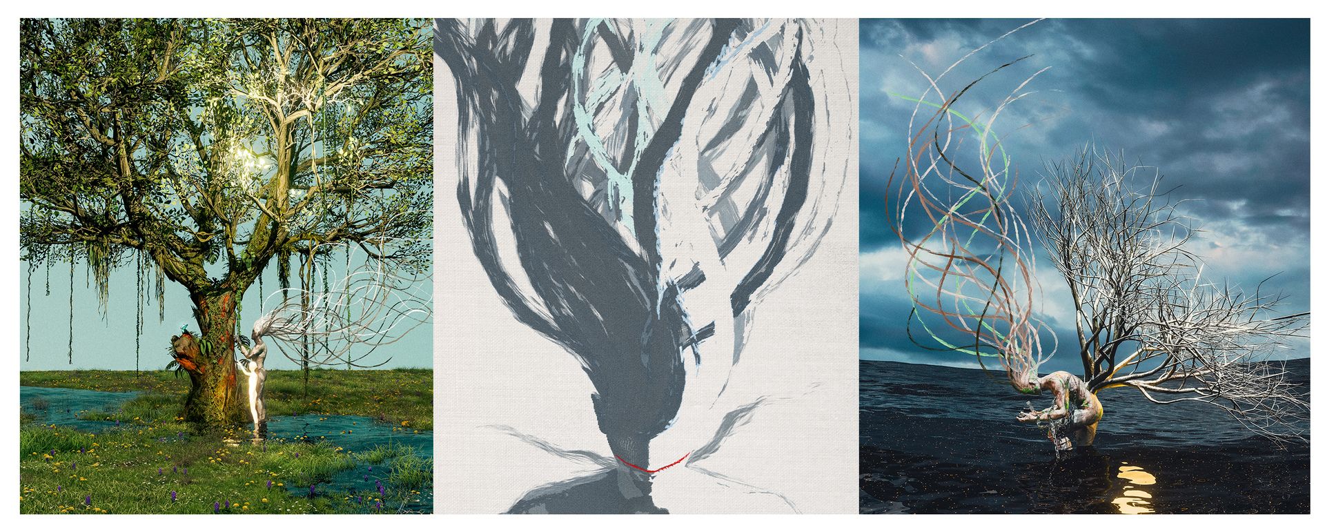 Later he created a follow-up: same scene, but the tree was fully grown now. A child stood in its shade. "His offspring don't have to know what happened."