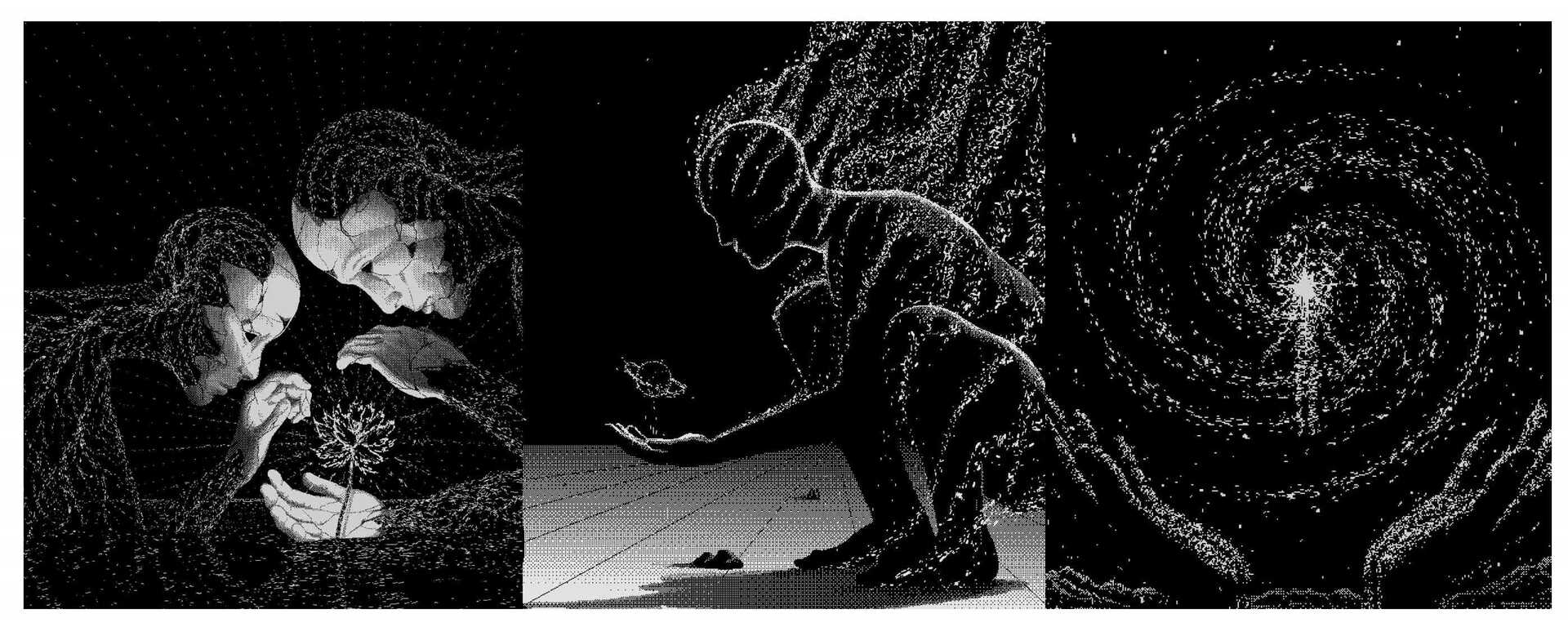 The Buddha figures that appear in his work aren't religious in a literal sense. They represent past wisdom, the accumulated knowledge of ages, now getting blurred and transformed by the modern era. His compositions often depict vast dark spaces, voids that could be the cosmos or the internet's infinite scroll, and somewhere in that darkness something appears: a figure, a flower, a moment of unexpected grace.