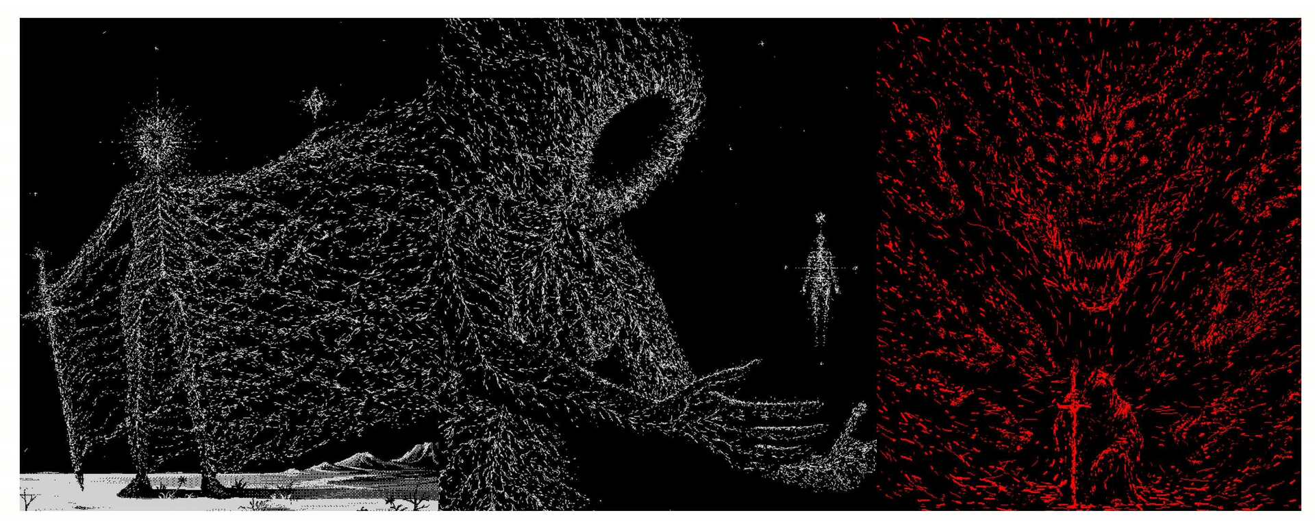 He calls the style "dirty pixels," and the term fits. The images look sketched rather than constructed, alive with what he describes as "pointillistic noise," thousands of pixel points creating depth and atmosphere the way a charcoal drawing builds tone through accumulated marks. A pixel is the smallest unit in digital art, just as a point is the smallest unit in traditional drawing, so his work becomes a kind of chaotic digital pointillism.