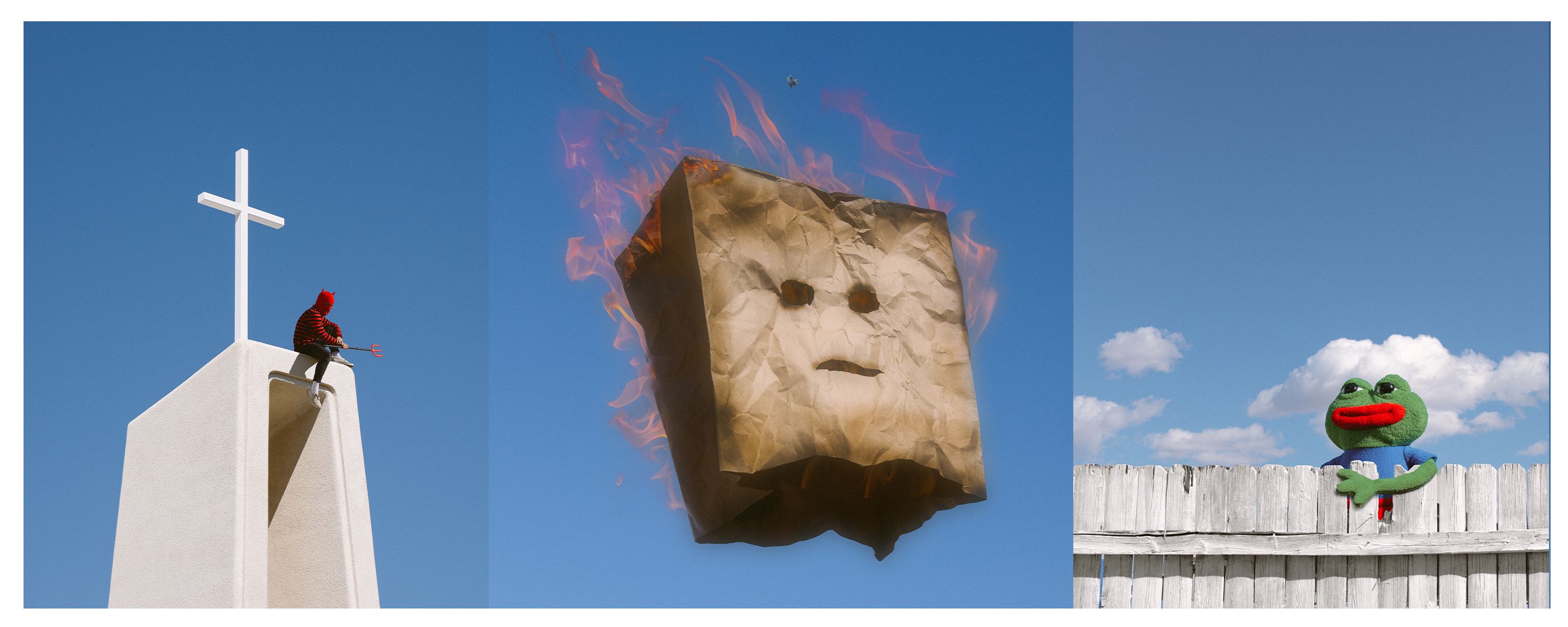 Most of Daniel's characters have something obscuring their face, which started practically (he uses himself as the subject and doesn't want the work to be about his identity) and became something more principled over time. Mr. Blue Sky has an emoji for a head, a commentary on digital communication that Daniel says he's outgrowing because it's almost too easy, you're literally showing people exactly what the emotion is. The Devil appears as a playful, silly figure rather than a menacing one, which some people love and some people refuse to engage with entirely.